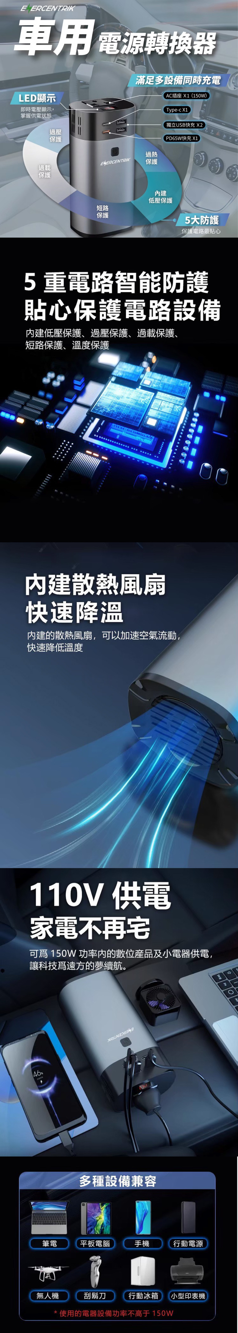 ·額定輸入電壓 DC12 ·最大輸出功率 150W ·AC 輸出電壓 AC110V±10% ·AC 輸出頻率 60HZ ·保險絲 15A ·Type-C1 5V3A 9V2A 12V1.5A Max ·Type-C2 5V3A 9V3A 12V3A 20V3.25A Max ·USB-A1 5V3A 9V2A 12V1.5A Max ·USB-A2 5V3A 9V2A 12V1.5A Max ·機器尺寸 6.5*13.3cm ·機器重量 0.38kg